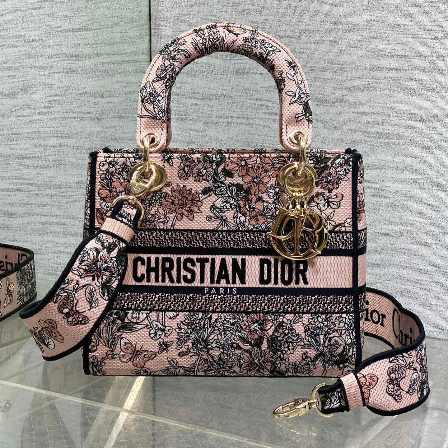 DIOR 25S SMALL LADY D-LITE BAG 24 IN PINK DIOR FLOWERS CALENDAR ALLOVER EMBROIDERY