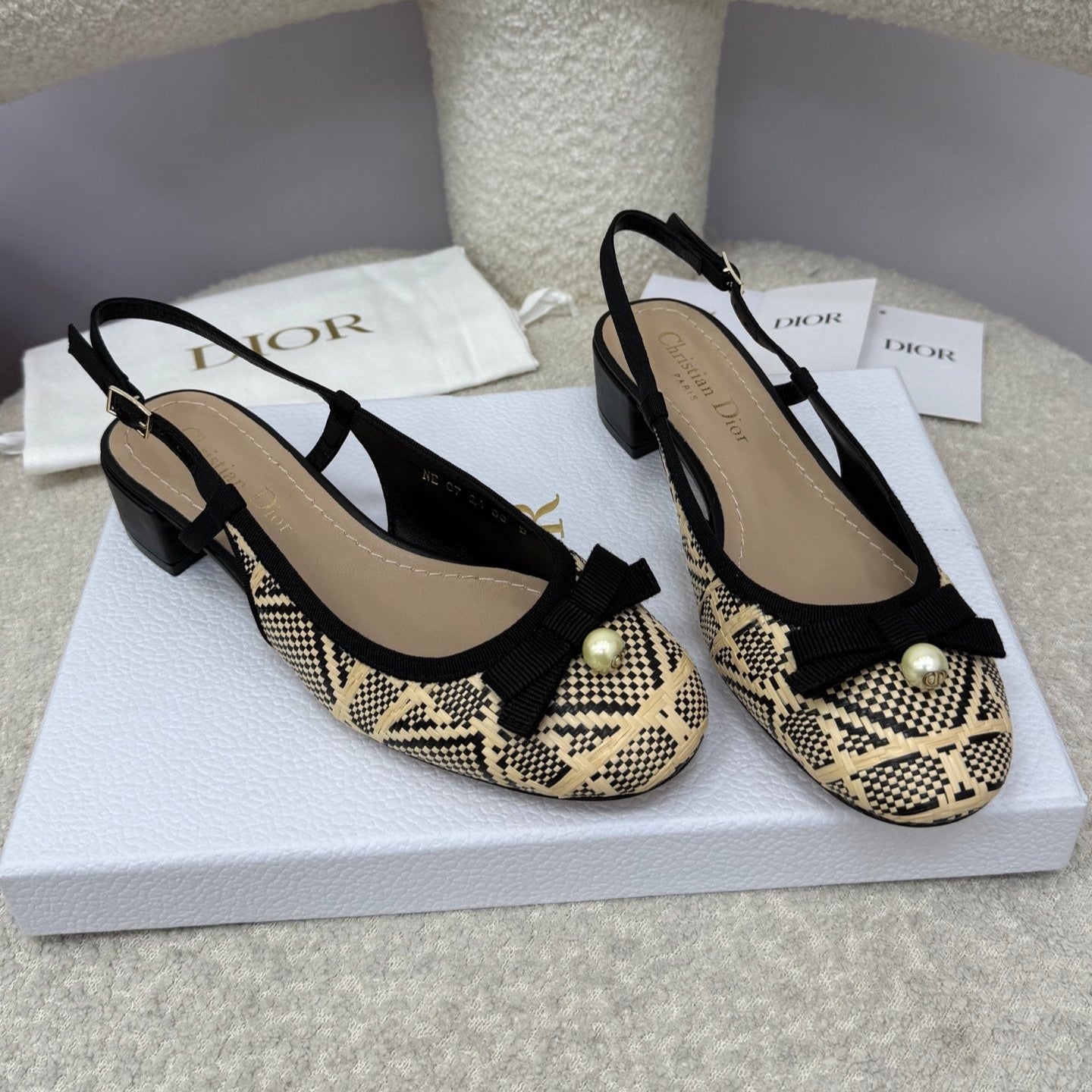 DIOR HIGH SLINGBACK 30 MM 25S IN BLACK AND BEIGE RAFFIA WITH PEARL