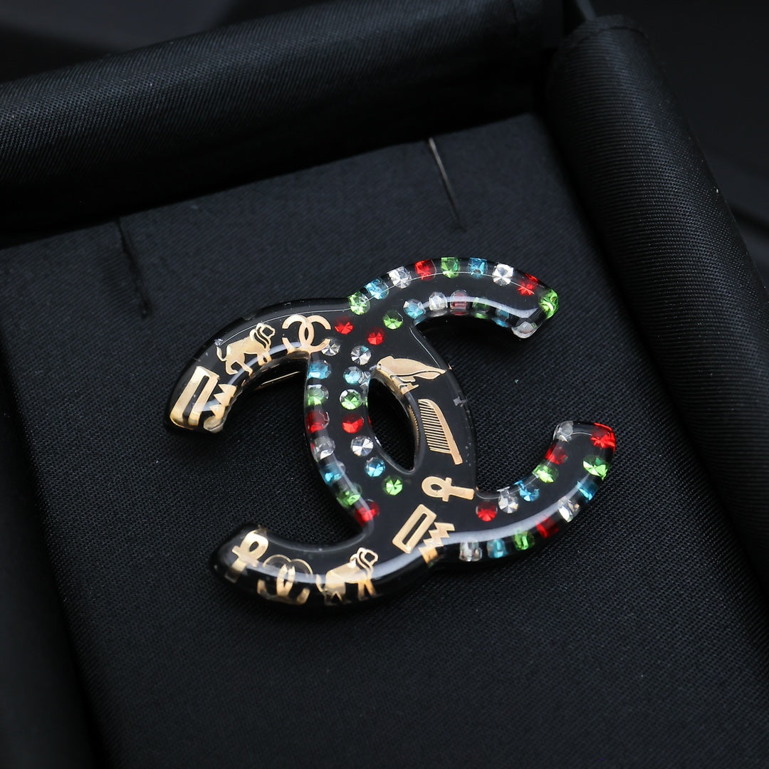DOUBLE C BROOCH IN HAND-PAINTED ACRYLIC RESIN WITH COLORFUL STONE DESIGN