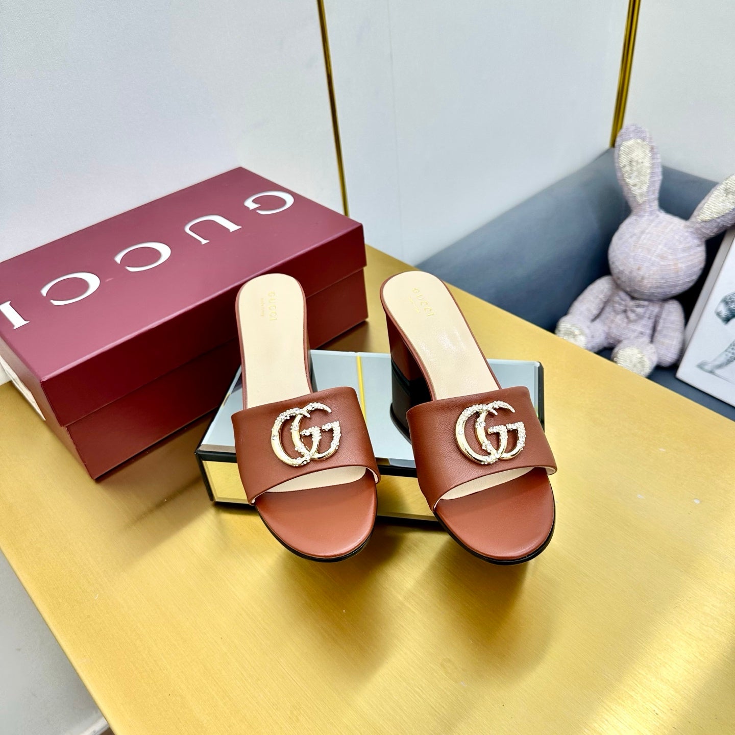 GG HIGH HEELS IN BROWN CALFSKIN GOLD-TONE HARDWARE WITH RHINESTONES