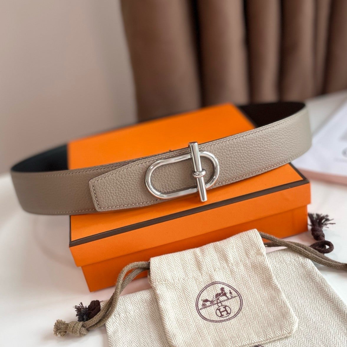 HM ITHAQUE BELT SILVER BUCKLE & REVERSIBLE CAMEL BROWN AND BLACK LEATHER STRAP 38MM