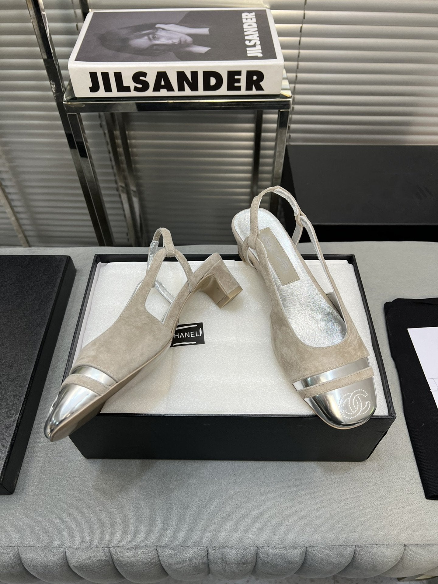 slingback light beige suede silver metalic lambskin square toe 5.0